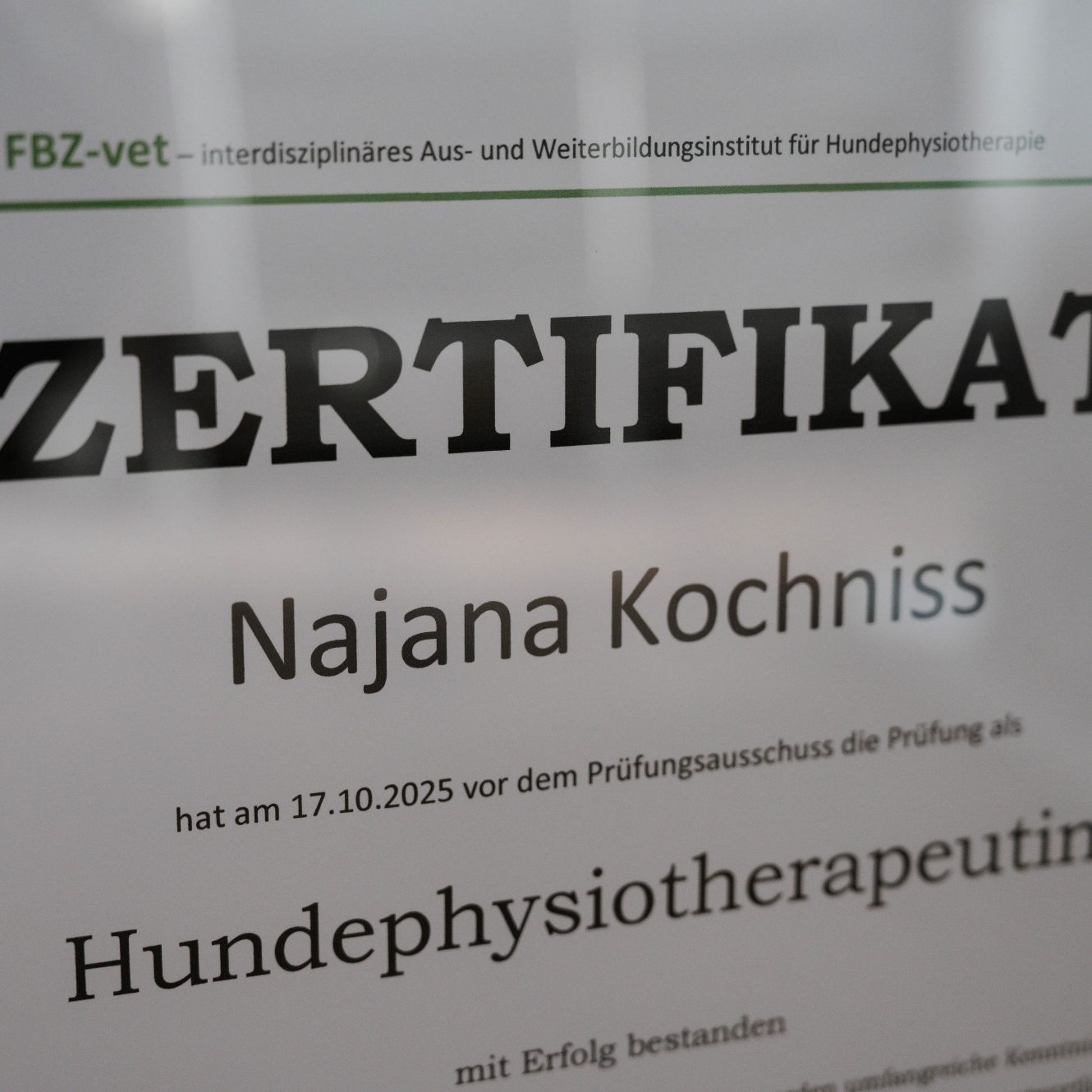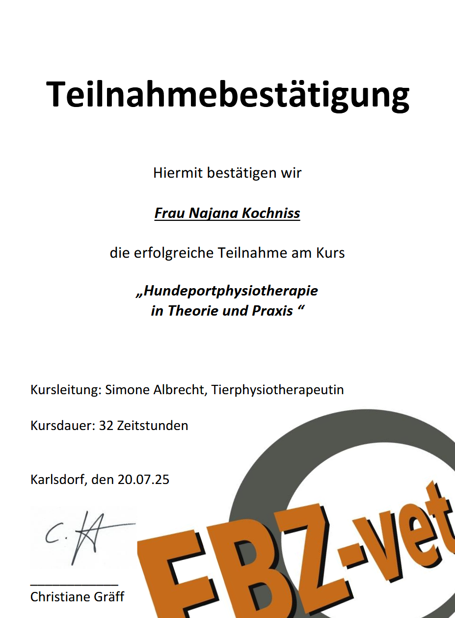 Meine Ausbildung zur Hundephysiotherapeutin absolvierte ich am FBZ-vet (Aus- und Fortbildungszentrum für Hundephysiotherapie).
